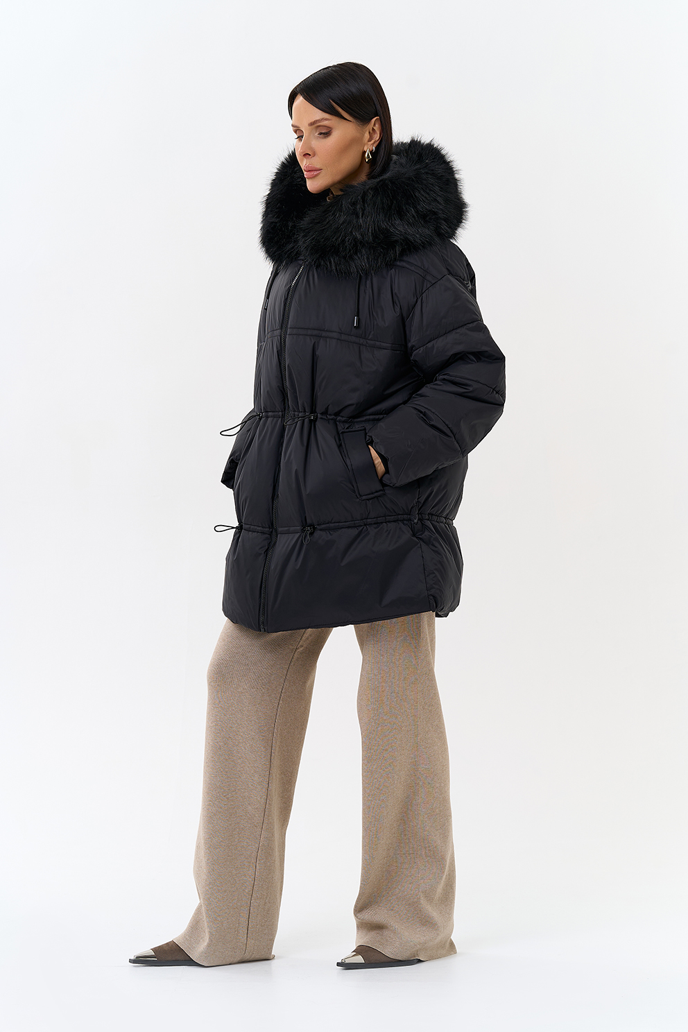 Крой воротника - капюшон, отделка искусственный мех