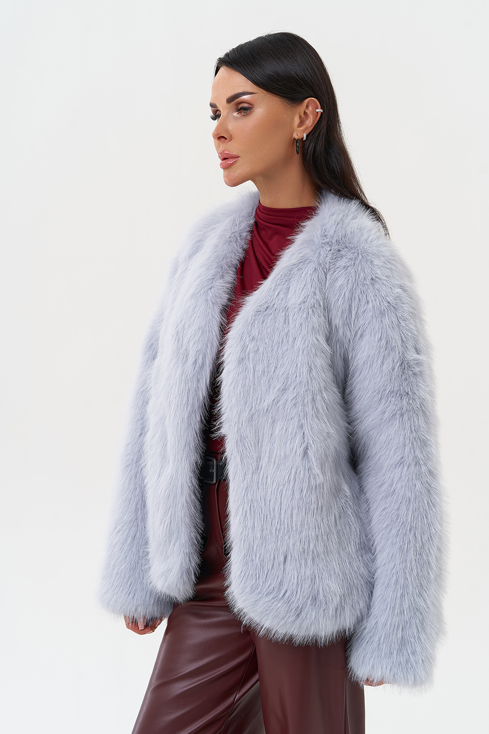 Фасон - прямой Длина изделия - 60 см Цвет - голубой Материал - экомех Состав полотна - полиэстер 100% Подкладка - полиэстер 100% Вид застежки -крючки, пояс Вид ворота - V-образный Фасон рукава - спущенное плечо, длинный |